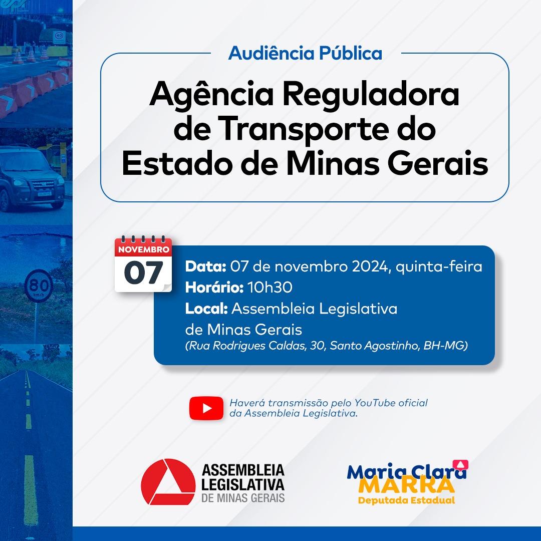 Na próxima quinta-feira, 7 de novembro, às 10h30, a Assembleia Legislativa de Minas Gerais (ALMG) realizará uma audiência pública convocada pela deputada estadual Maria Clara Marra, vice-presidente da Comissão de Transportes, para discutir a criação da Agência Reguladora de Transportes do Estado de Minas Gerais (Artemig).