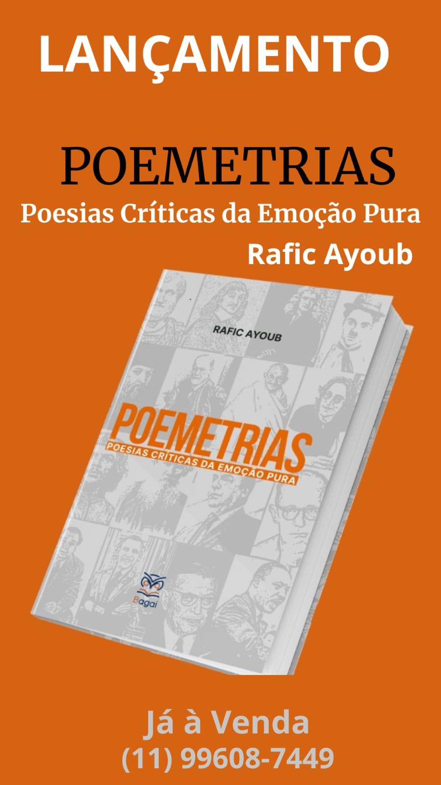 Como poeta, escritor e dramaturgo, neste seu livro de estreia no universo da poesia, intitulado POEMETRIAS – POESIAS CRÍTICAS DA EMOÇÃO PURA, Rafic Ayoub propõe um provocativo contraponto ao culto à razão consagrado por Kant, através de uma releitura sensível e criativa da emoção desperta e refletida nas obras de alguns personagens históricos e autores clássicos e contemporâneos das diversas áreas do pensamento universal.